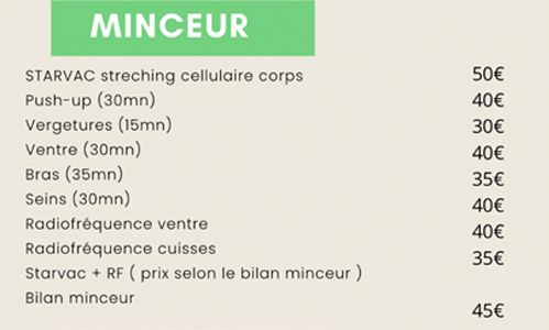 Dans le but de vous offrir une solution complète et équilibrée, nous combinons les différentes techniques et technologies, telles que : le stretching cellulaire par STARVAC DXTWIN, la radiofréquence, les massages, les soins du corps, les conseils nutritionnels. Nous vous fournissons également un accompagnement adapté et des conseils avisés pour maximiser les effets de votre soin minceur.